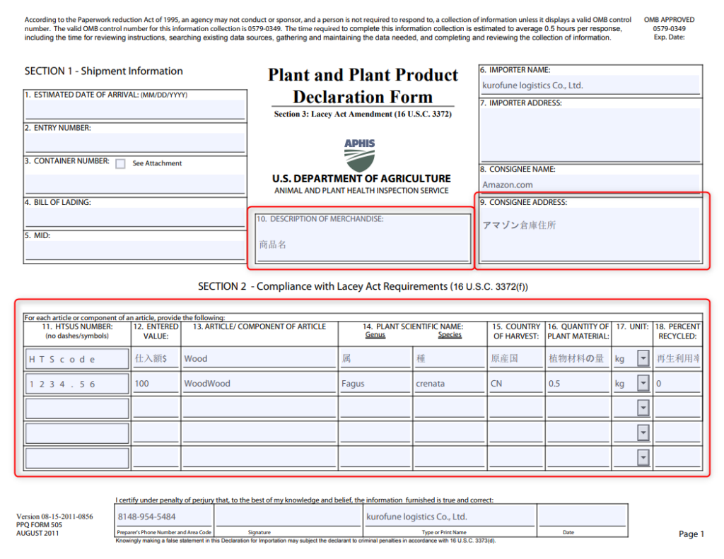 品名・価格・数量とともに木材が伐採された国と木材の樹種の申告が必要になります。(レイシー法)