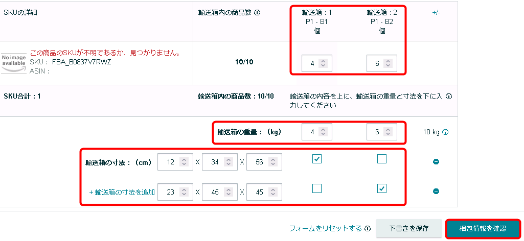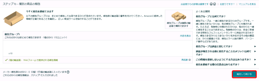 すべての入力が完了したら梱包情報を確認をクリックします。
