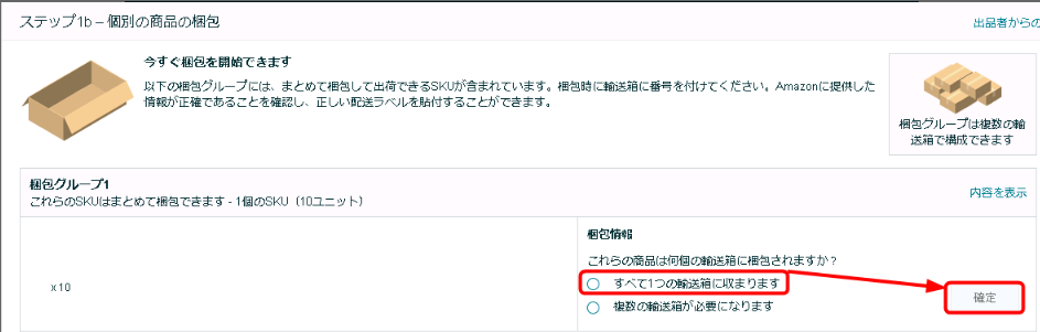すべて1つの輸送箱に収まります、にチェックを入れ確定ボタンをクリックします。