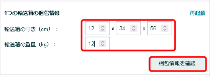 輸送箱の3辺(cm)と重量(Kg)を入力し梱包情報を確認をクリックします。