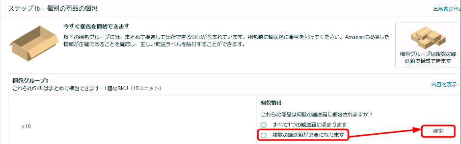 複数の輸送箱が必要になりますにチェックを入れ確定ボタンをクリックします。