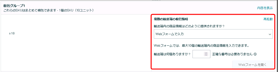 輸送箱内の商品情報をどのように提供するかを選択し、輸送箱数を入力、Webフォームを開くもしくはExcelファイル作成をクリックします。