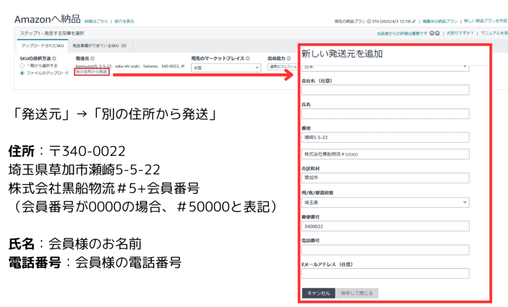 納品プラン作成の際、発送元を黒船倉庫の住所へ変更してください。送付先住所は下記になります。
