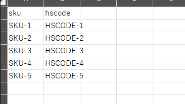 HSコードリスト:下記サンプルより、SKUごとにHSコードを記載し、アップロードする。