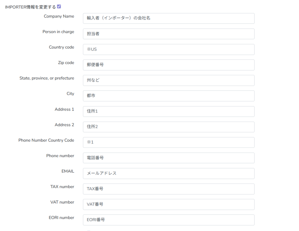 チェックを入れると、以下インポーター情報を入力する項目が現れます。